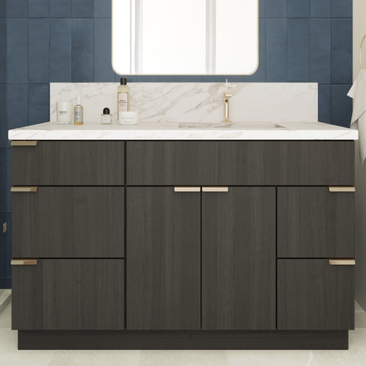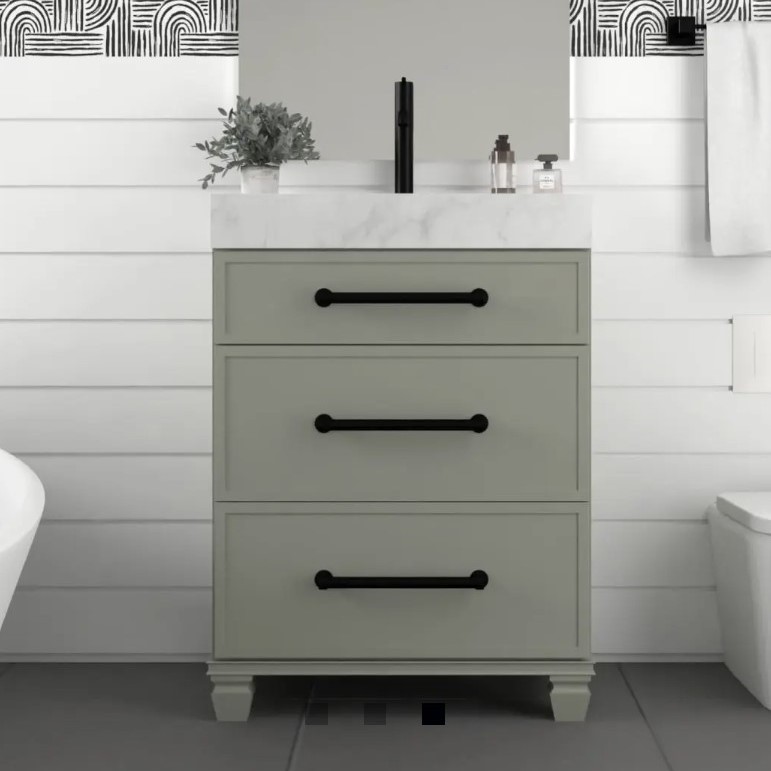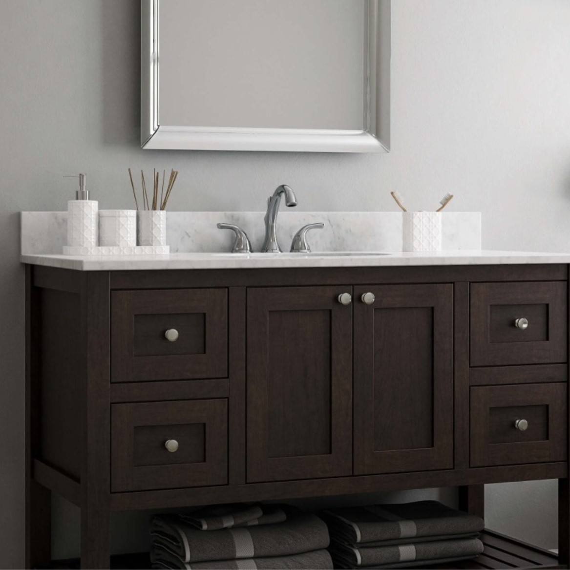 We offer vanities as part of a complete design package. You can select your cabinetry through us, and we will help you coordinate the perfect stone countertop (quartz, marble, or granite) and sink style to go with it.