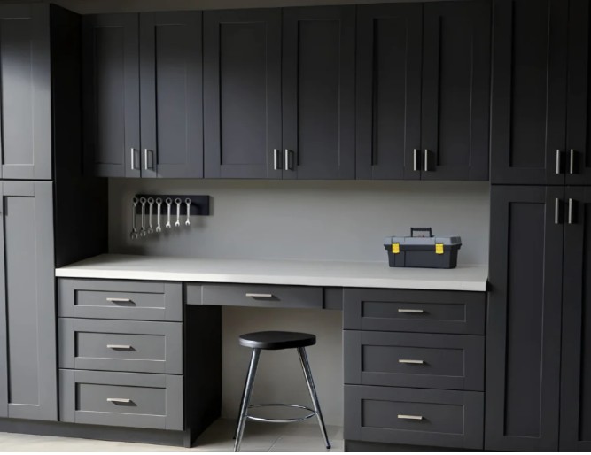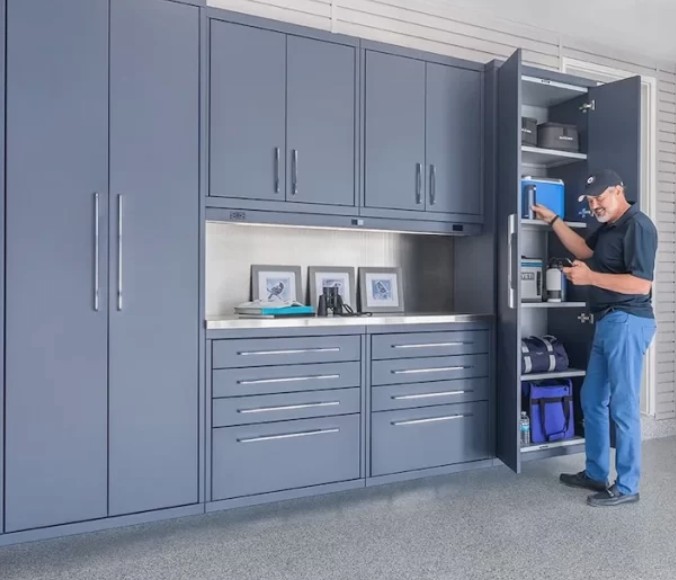 Streamlined Aesthetics: Cabinets instantly hide the visual "noise" of open shelving. By tucking items behind sleek doors, you achieve a neat, uniform appearance that makes the entire garage feel larger and more inviting.